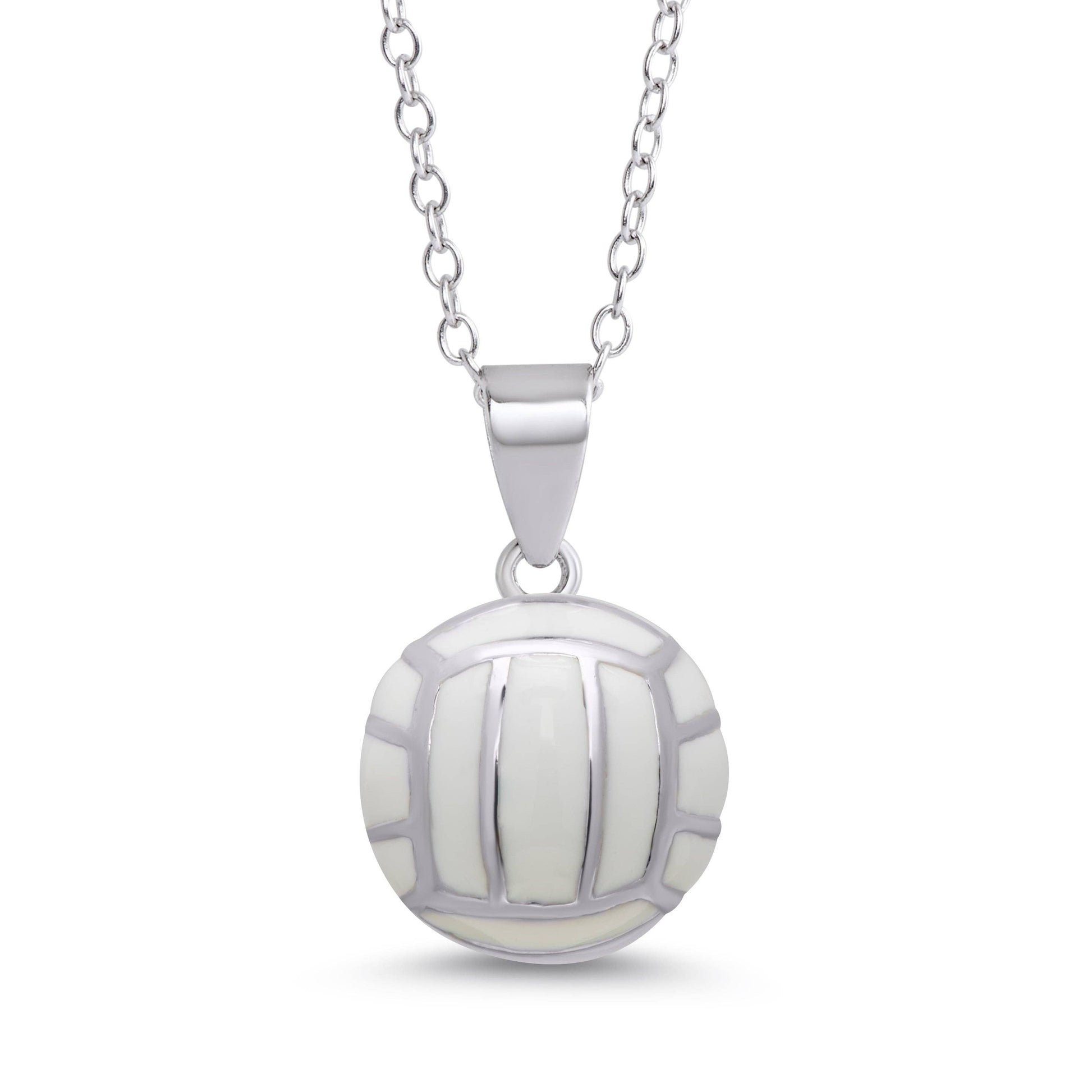 This beautiful necklace features a 3D volleyball pendant adorned with silver plating and enamel. Necklace is adjustable 14"-16" and secures with lobster clasp.