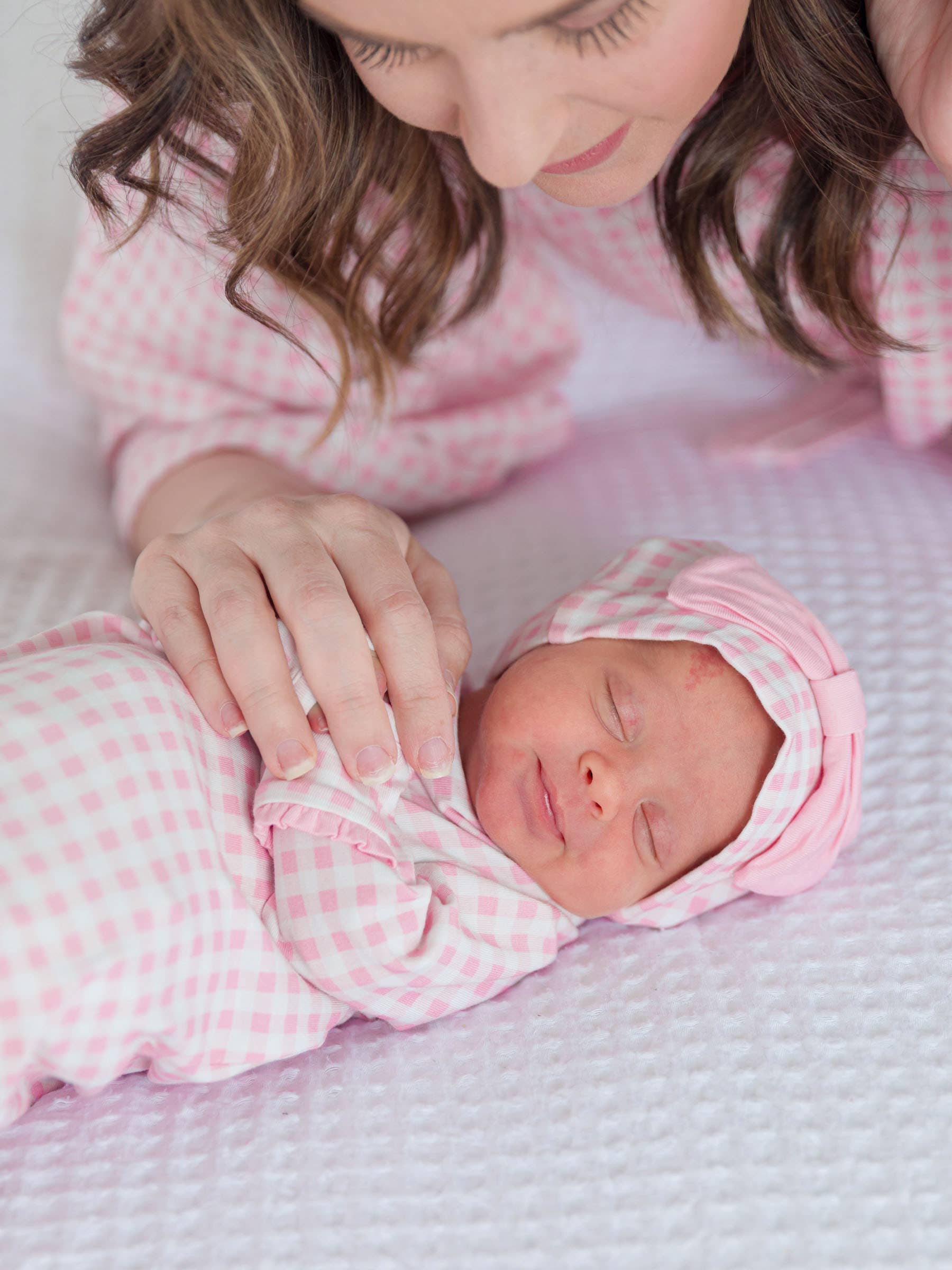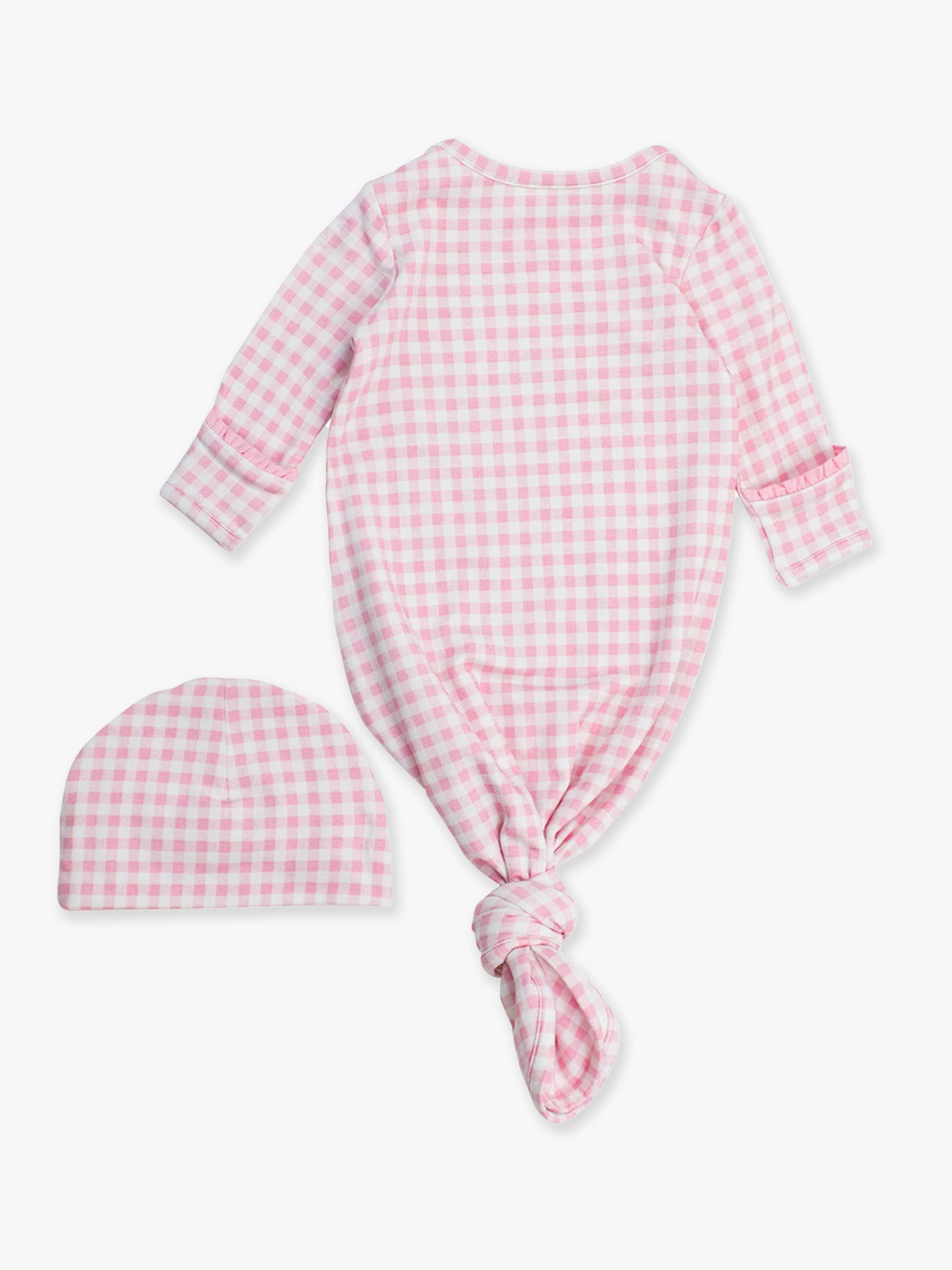 Baby Girls Pink Gingham Modal Blend Ruffle Knotted Sleep Gown & Hat Set : Pink
