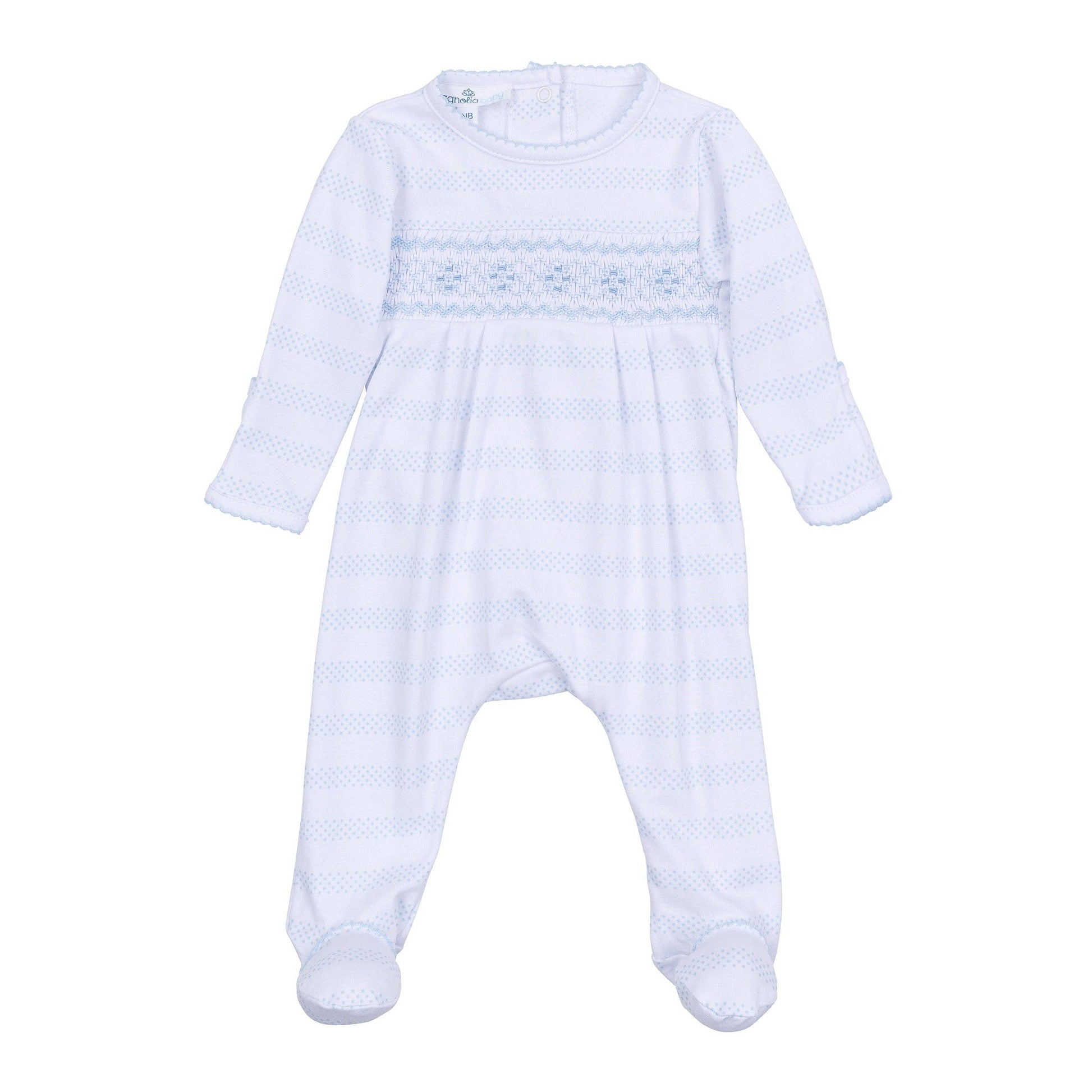 Woven from the most exquisite Pima Cotton, this light blue smocked footie from our Baby of Mine collection offers tender comfort and a touch of classic charm. Delicate light blue picot trim edges the neckline and cuffs, complemented by a subtle stripe made of points in matching light blue, just above the lovely smocked detail.