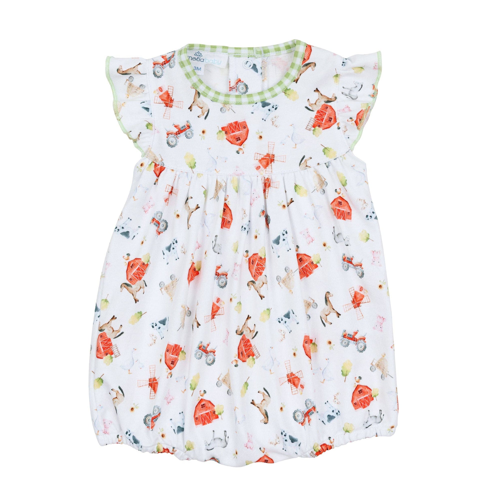 Our Barnyard Babies Print Ruffle Bubble embodies the pure joy of the countryside. This beautiful bubble, made with luxurious Pima Cotton, features a charming farm-themed print and adorable ruffles, ensuring your baby looks precious and stays comfortable.