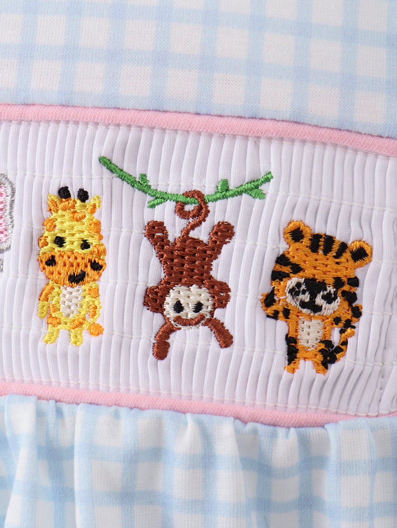 This charming blue animal smocked ruffle bloomer set brings playful style and comfort together. Featuring delightful animal prints with a delicate smocked bodice and flouncy ruffle details, it’s perfect for little adventurers who love to move and explore. Soft, breathable fabric ensures all-day comfort, making it a whimsical choice for sunny days and playtime fun.