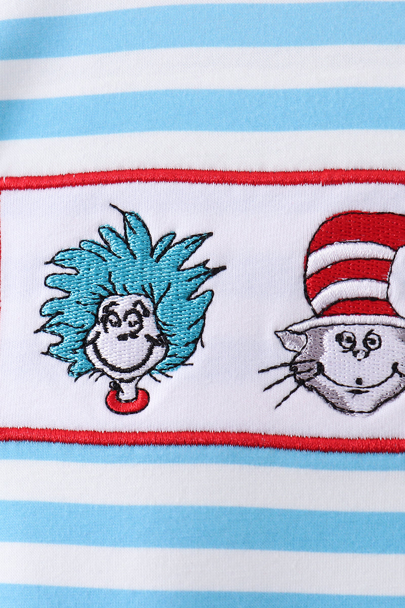 Meet the perfect playdate companion! This charming romper features vibrant blue stripes paired with delightful character embroidery that'll have little ones grinning from ear to ear. The relaxed fit ensures all-day comfort for crawling, playing, and exploring, while the classic stripe pattern keeps things timeless and versatile.