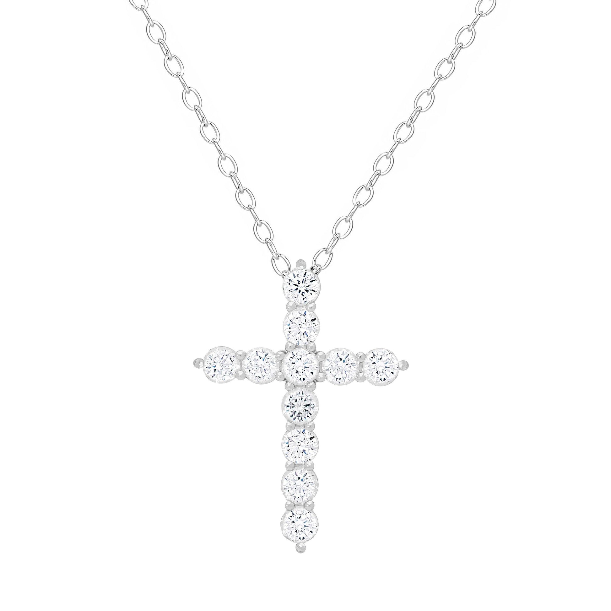 This beautiful necklace is crafted of sterling silver and features a cross with sparcling CZ gemstones. Necklace is adjustable 14" - 16" and secures with a spring clasp.