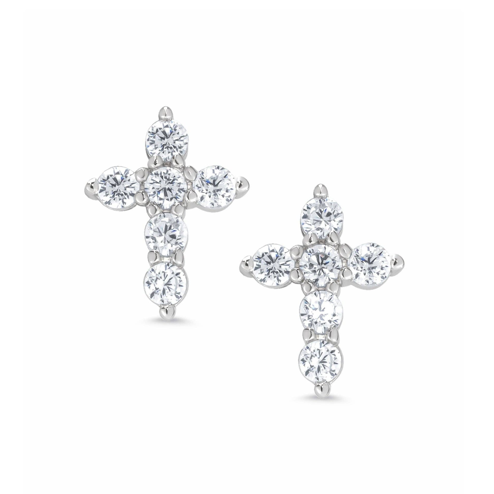 These beautiful cross stud earrings are crafted of sterling silver and feature prong set sparkling cz gemstones. Posts secure with friction back clasps.