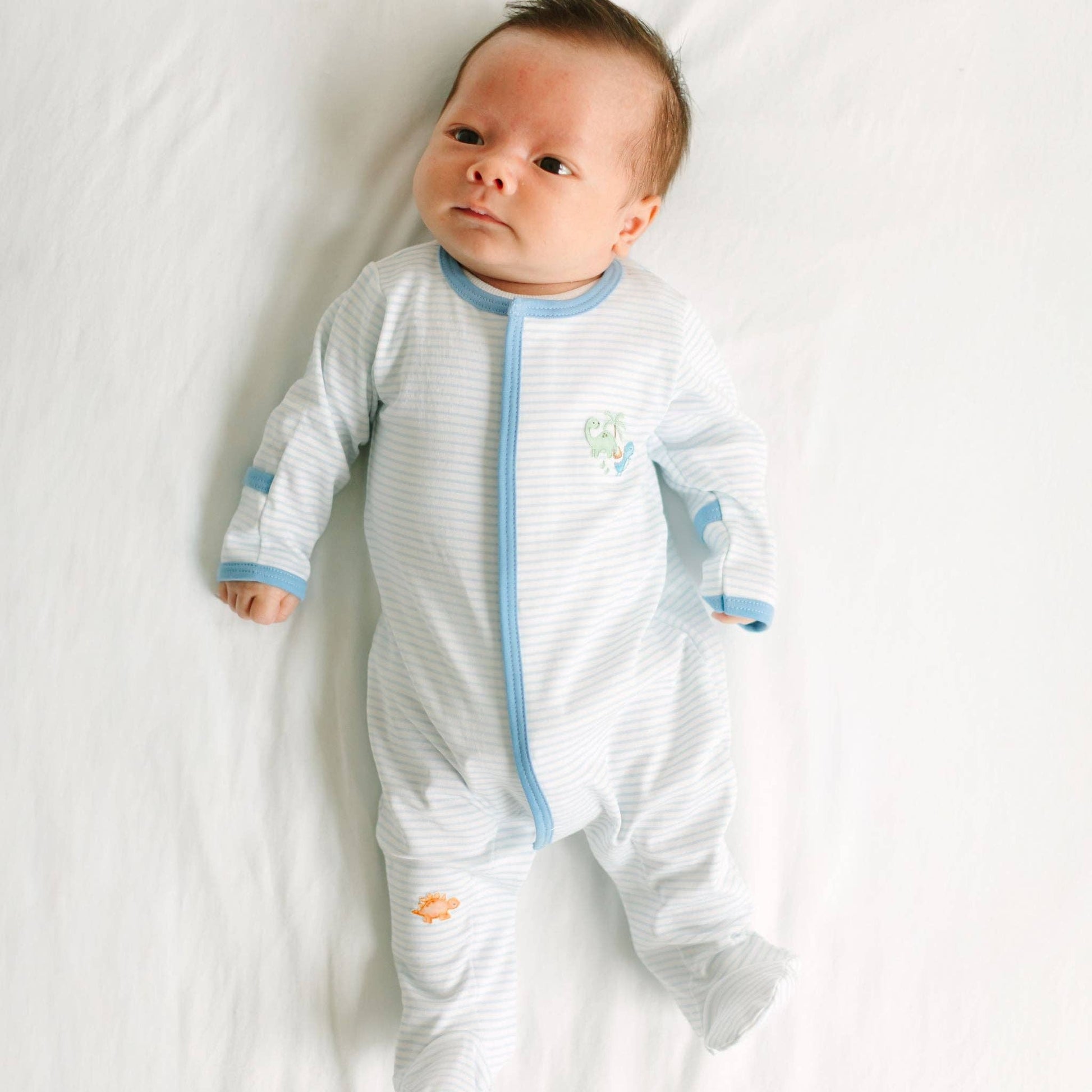 This charming one-piece, crafted from luxurious Pima Cotton, features a snap closure and a sweet dinosaur embroidered on the chest. The footie is designed for all-day wear with a comfortable fit and a contrasting scalloped edge detail on the collar and cuffs.