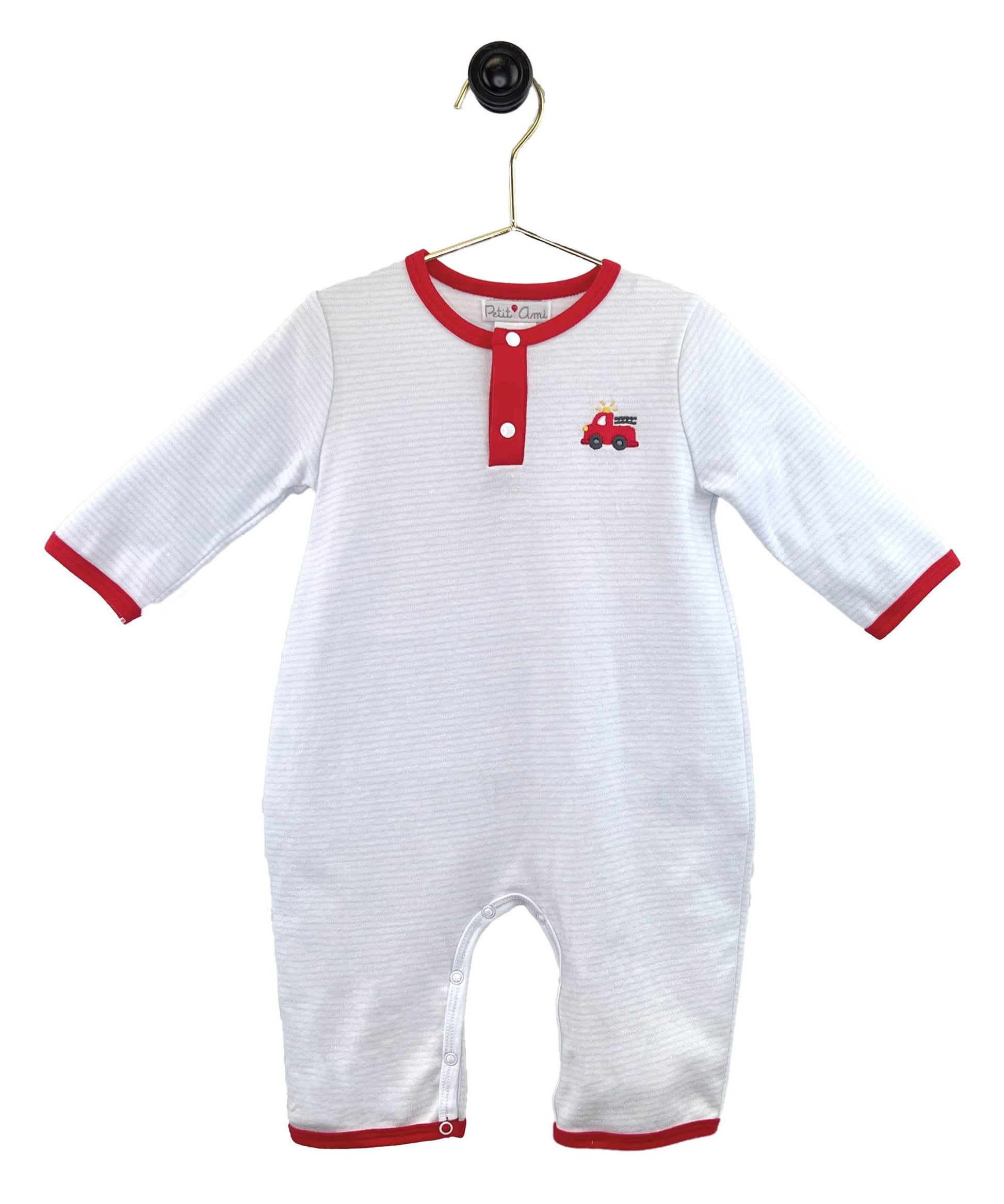Featuring a delicate light blue stripe print pattern with an embroidered firetruck on the front and red trim for just the right amount of detail. A perfect outfit for little ones on the move!