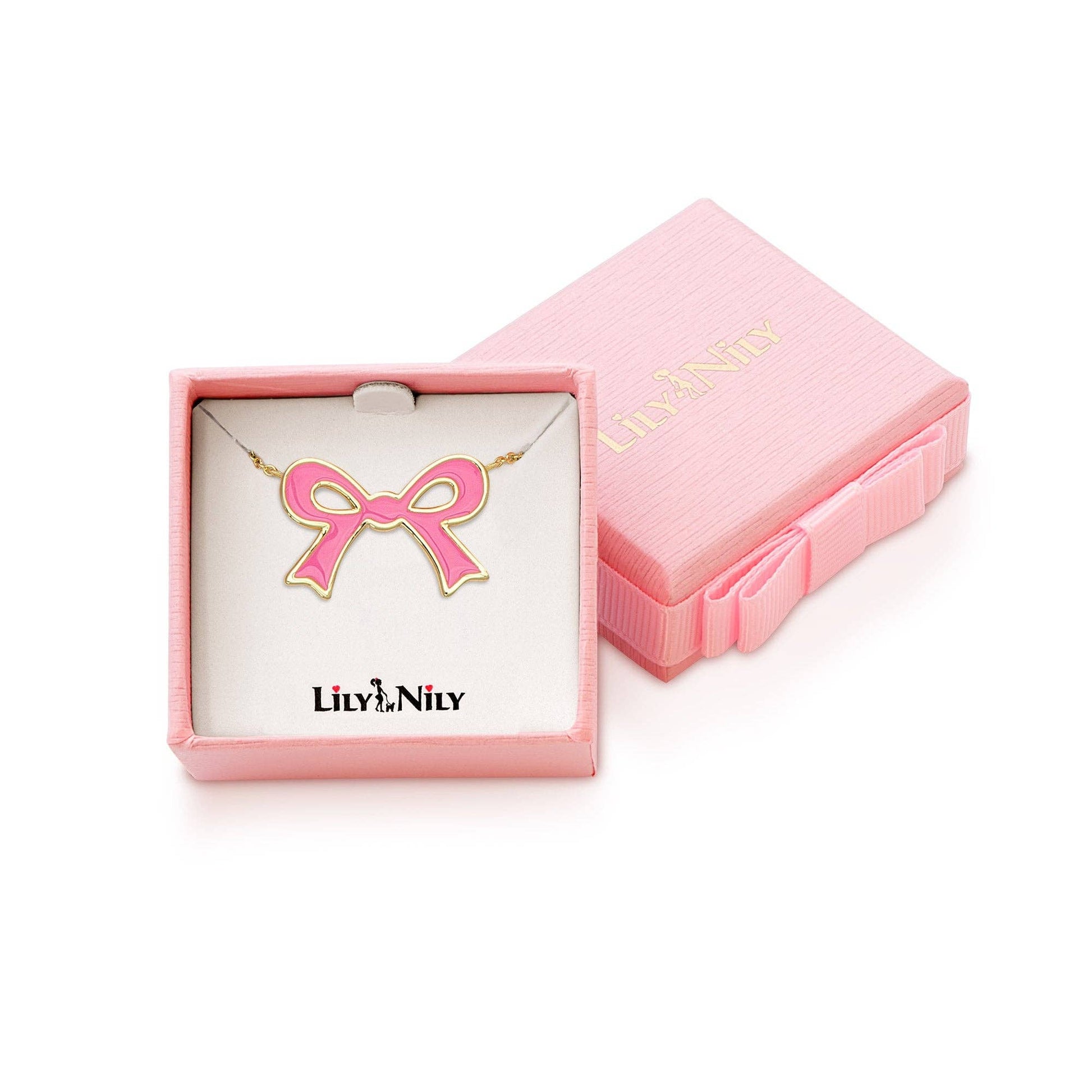 This beautiful necklace features a stylish bow pendant adorned with gold plating and enamel. Necklace is adjustable 14"-16" and secures with lobster clasp.