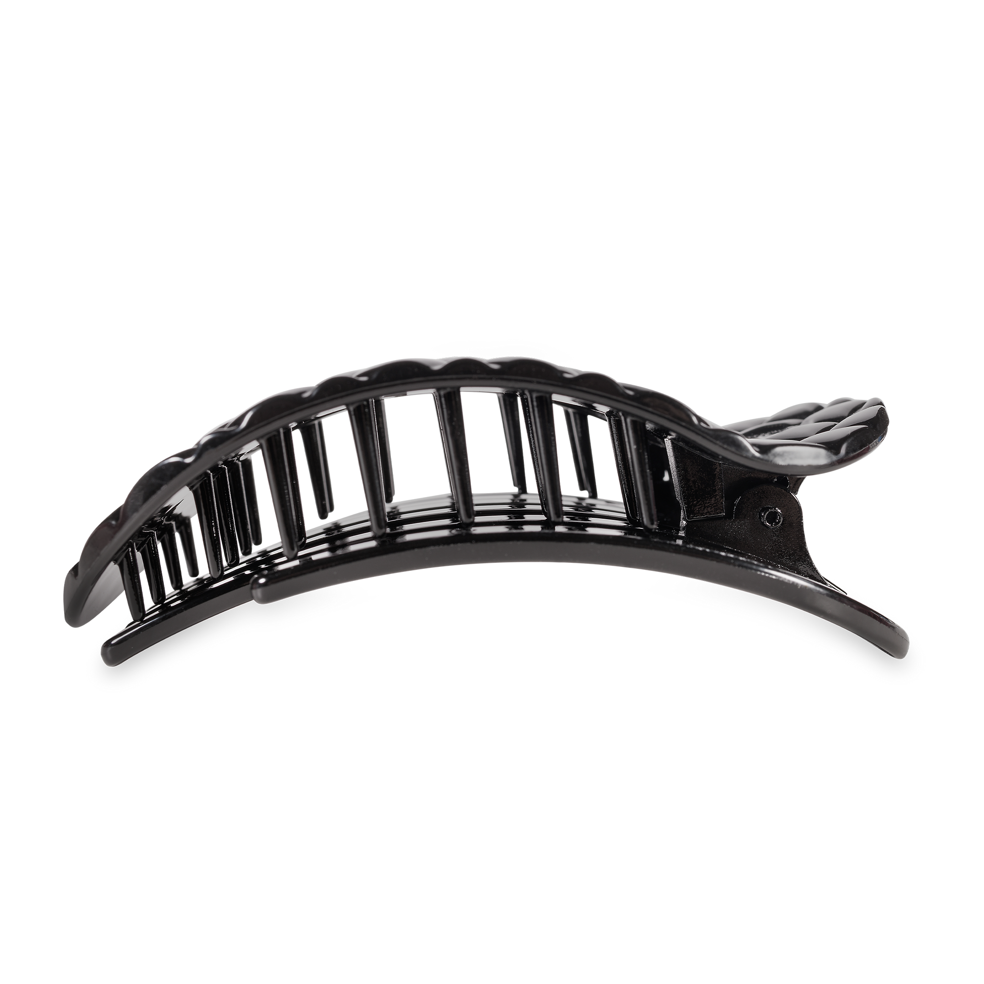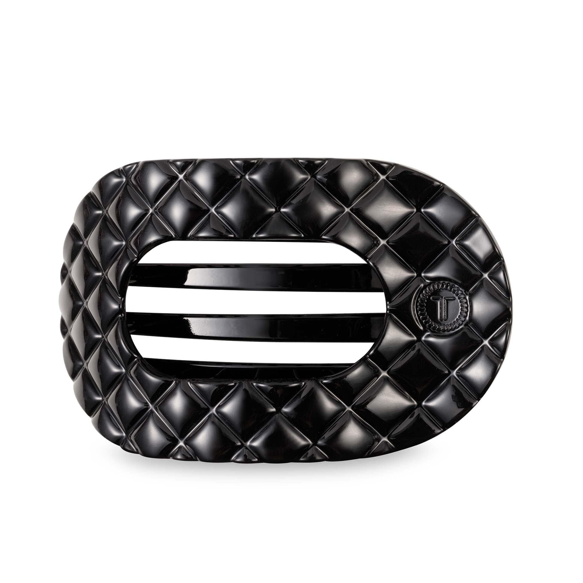 Lay flat and relax with the new TELETIES Jet Black Quilted Large Flat Round Hair Clip in Black. This hair clip is designed to allow you to lay back flat, do yoga, or sit comfortably in a seat with a headrest, and it is made with the same material that is nearly unbreakable.