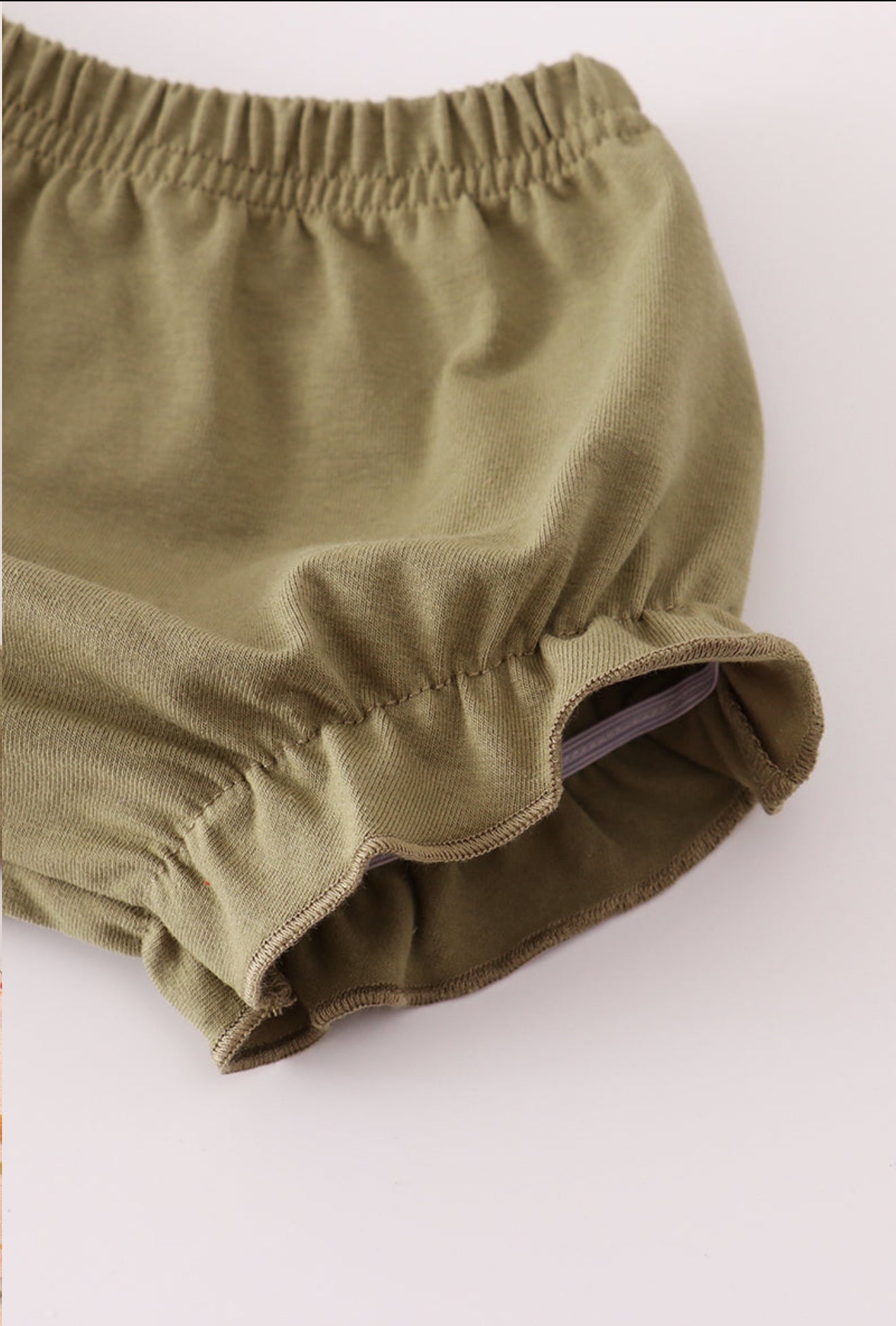 Dress your little one in adorable charm with this green pumpkin bow print bloomer set. Featuring a playful pumpkin pattern and cute bow details, it's perfect for sunny days and festive fun. Soft, comfortable fabric ensures all-day wearability while adding a touch of whimsy to any outfit.