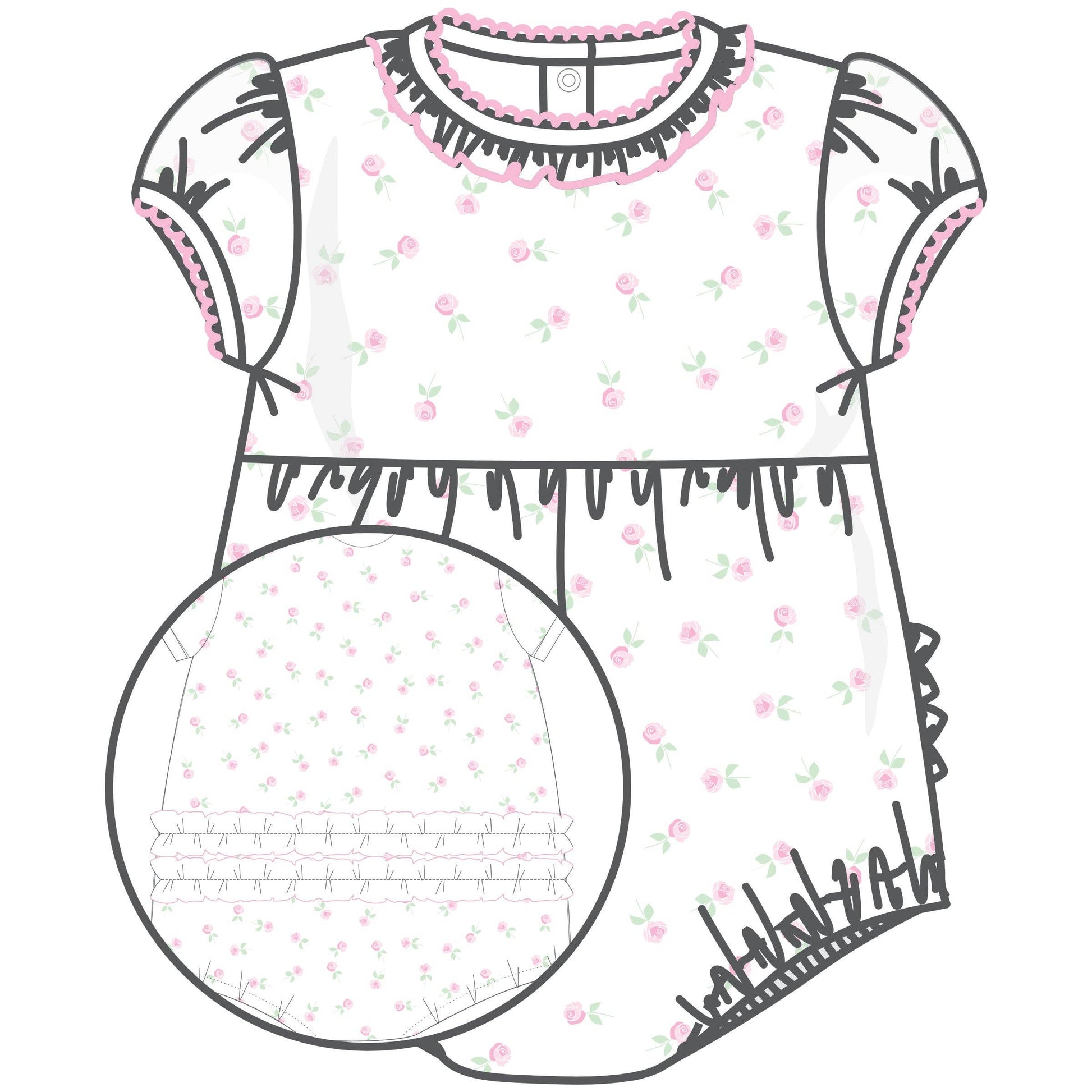 A sweet short sleeve bubble in luxurious Pima Cotton, featuring playful ruffles and an all-over tiny floral and dot print. This piece combines comfort with an adorable, classic look for warmer days.