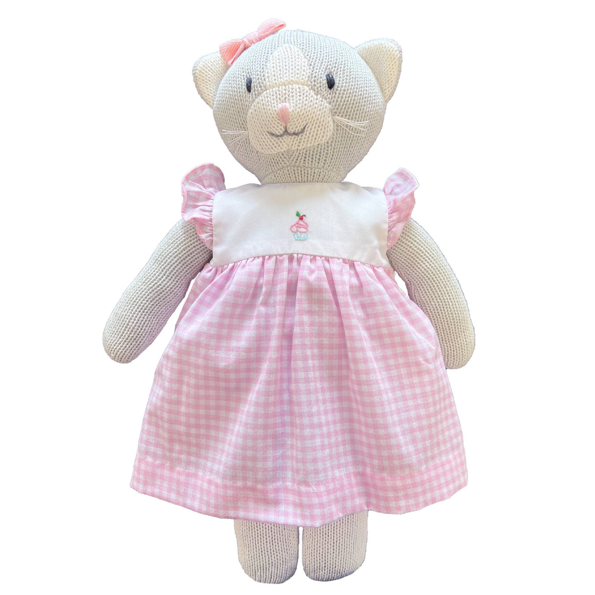 This hand-knit cat doll comes with an adorable angel wing sleeve pink check dress that matches our girls Cupcake Diaper Set and Cupcake Dress. This cotton knit kitty doll makes the perfect friend for birthday parties or just playing around!
