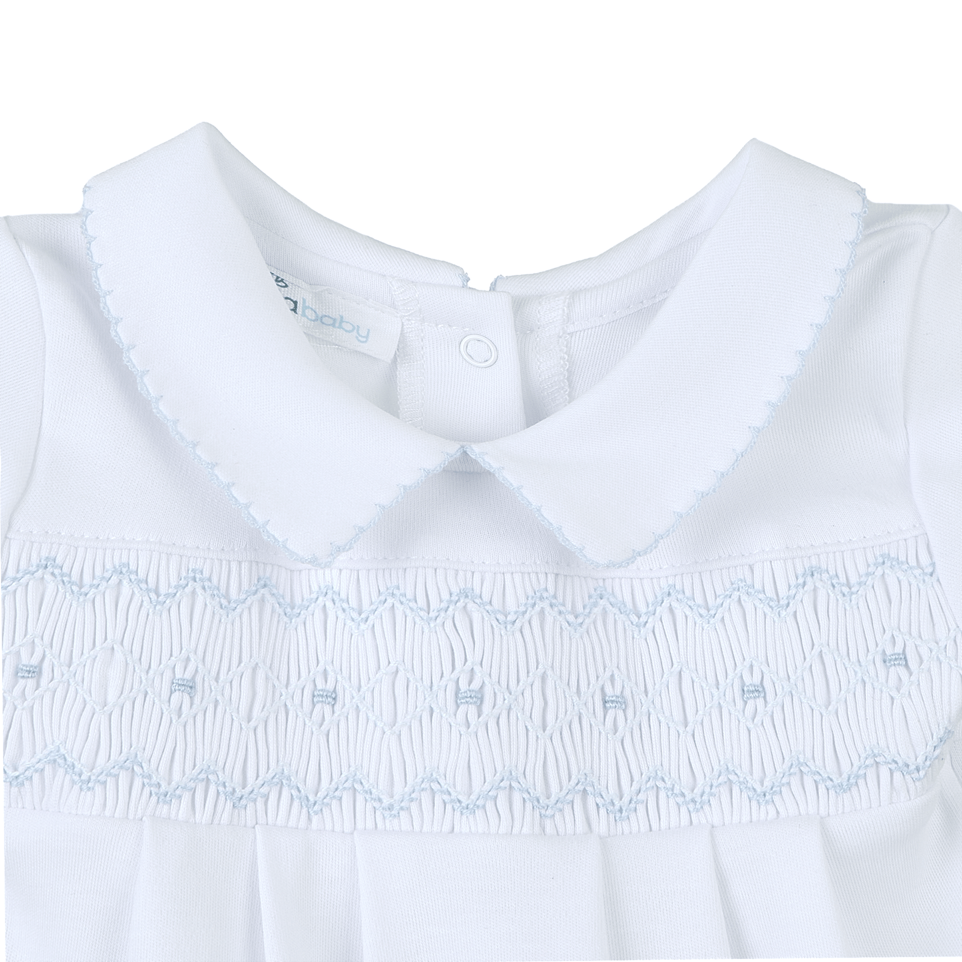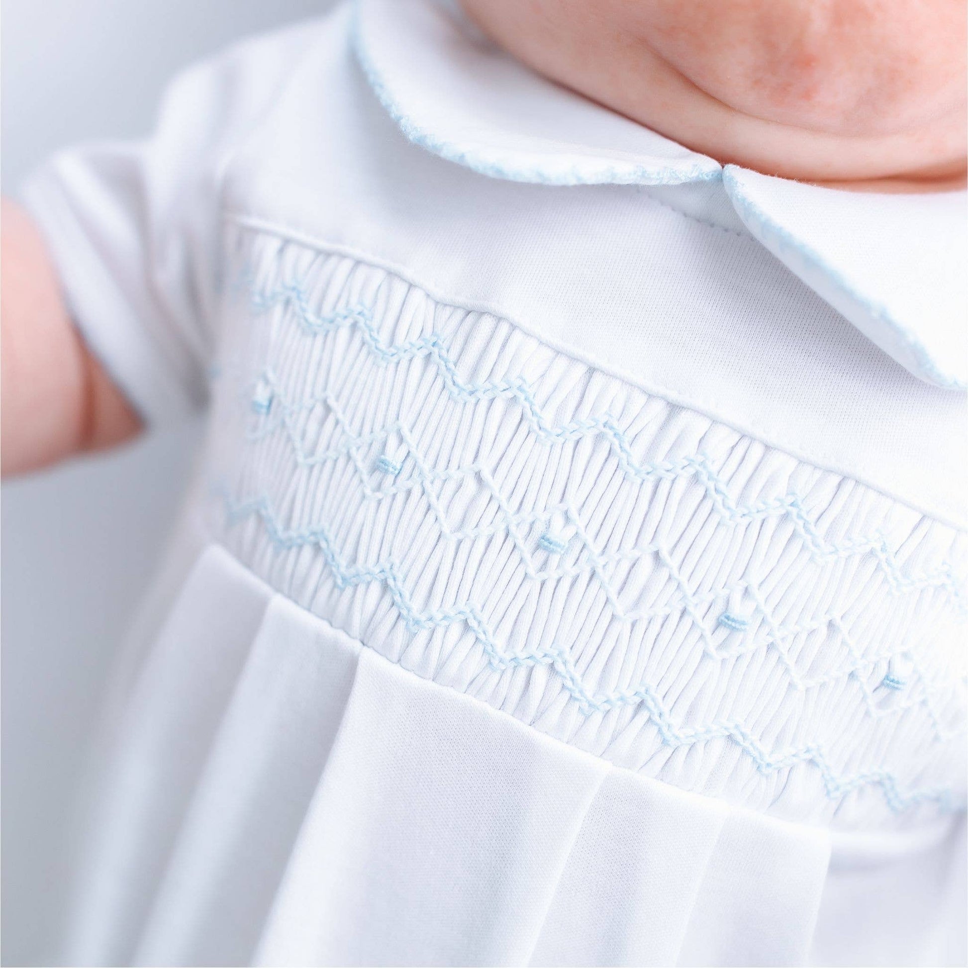 An irresistibly charming short-sleeve bubble featuring delicate smocking and a sweet light blue shade. Designed for joyful play and comfortable wear on warmer days.