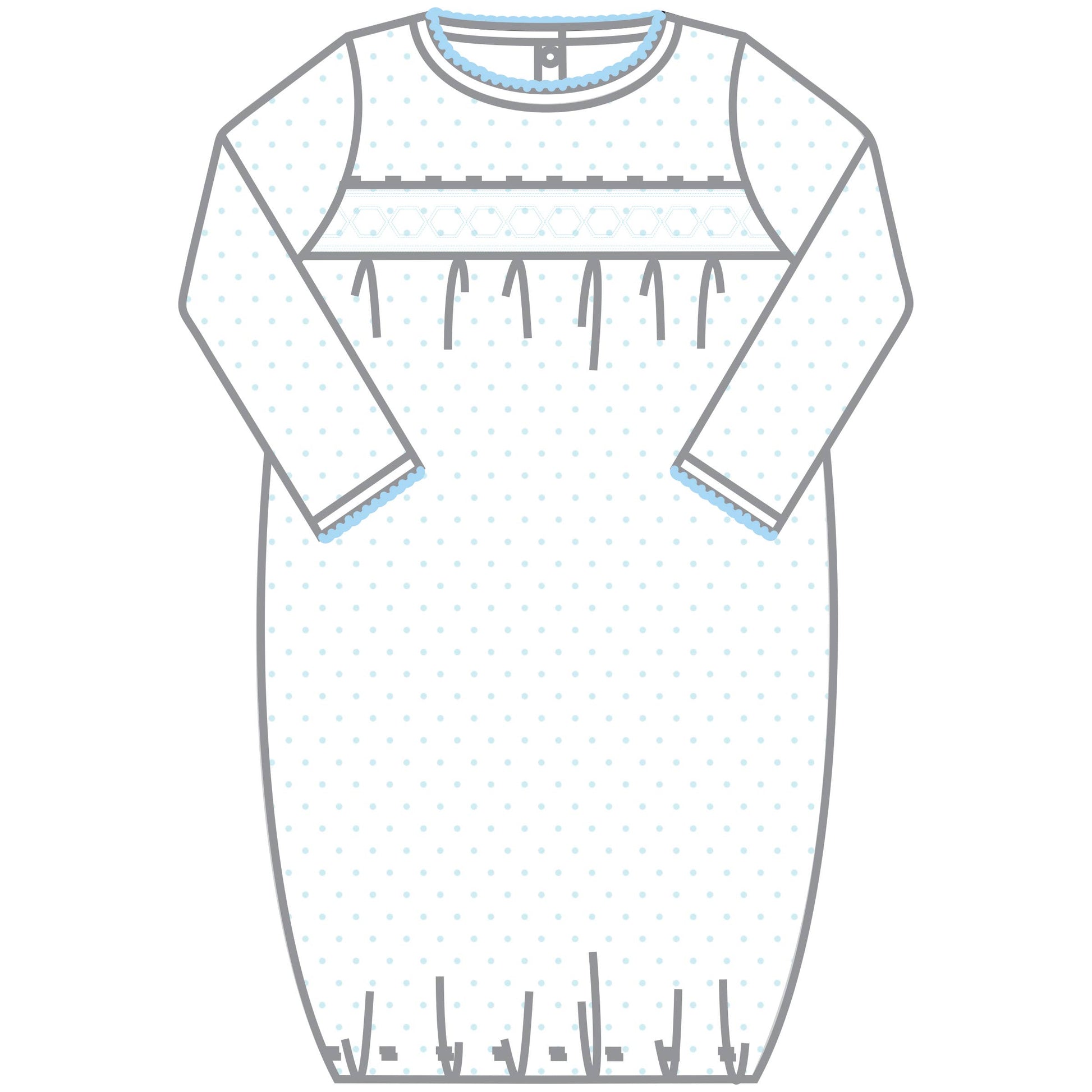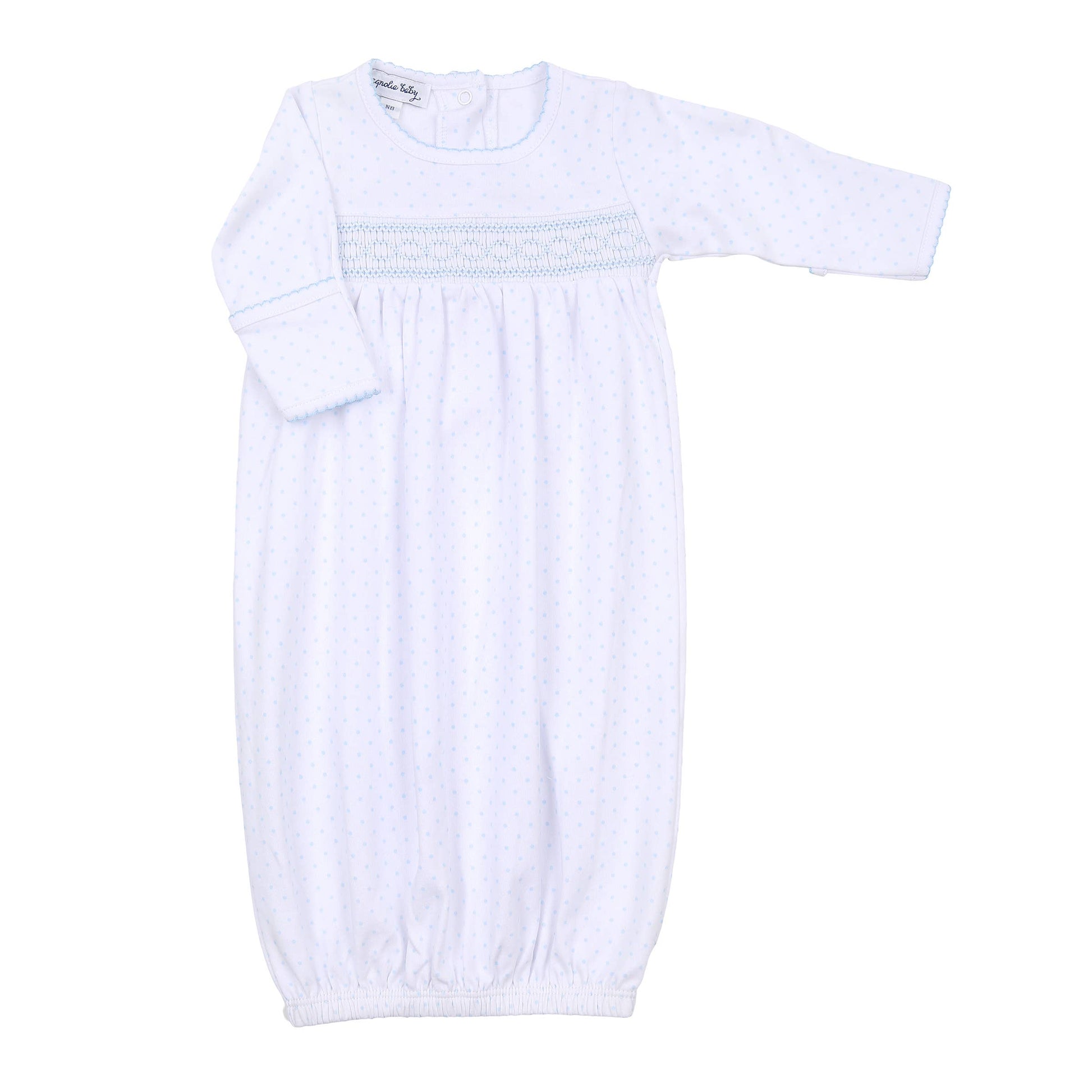 Magnolia Baby presents the Mini Dots Smocked Gown in blue, a non-footed bodysuit designed with your baby's comfort in mind. Made from 100% Pima cotton, this gown is synonymous with comfort, style, and luxury. We are committed to providing finely detailed, sophisticated designs for babies and children. This gown is no exception, with a focus on wearability and quality. Dress your little one in fresh, stylish sophistication for everyday moments and special occasions with our Mini Dots Smocked Gown.