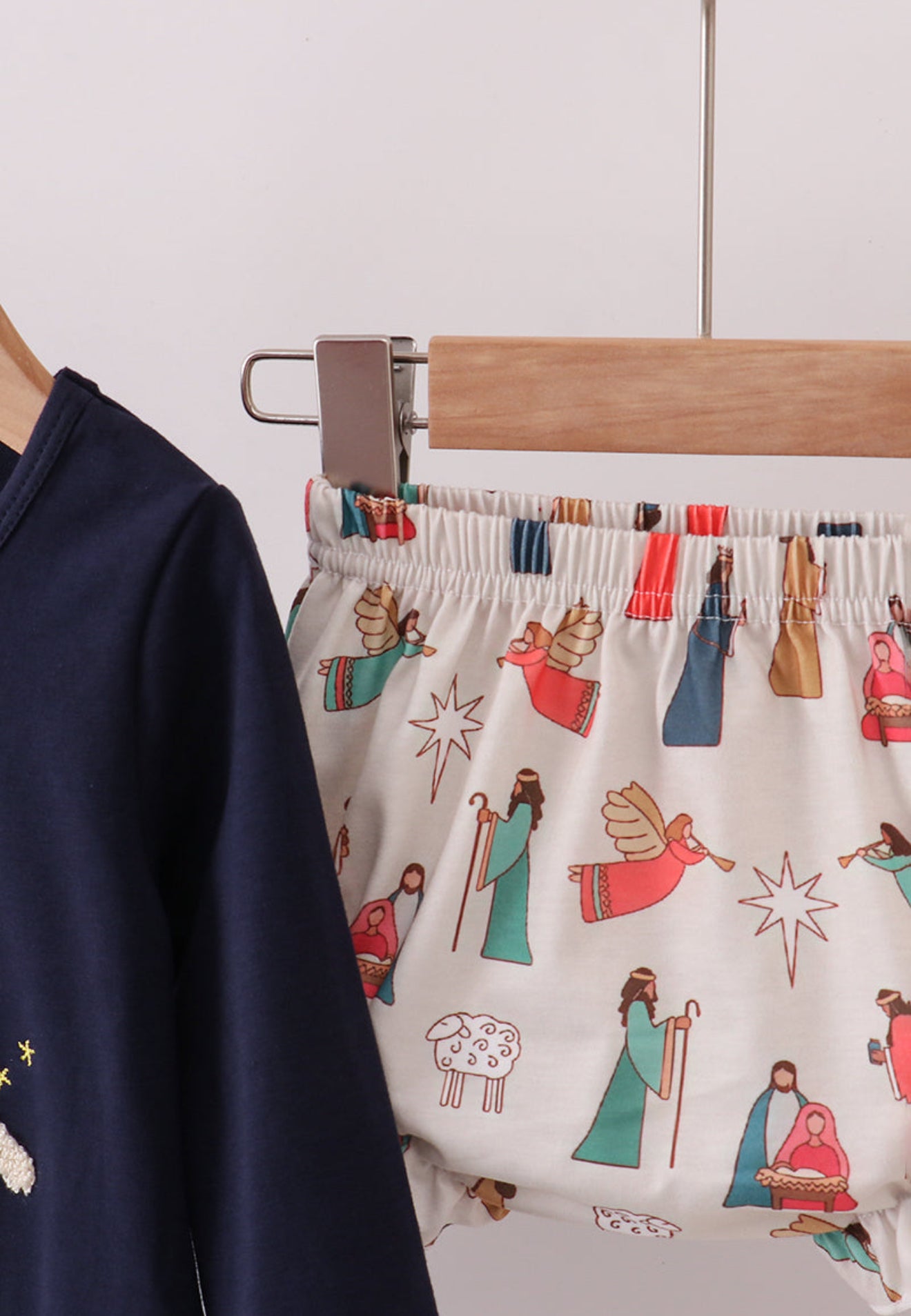 Dress your little one in festive charm with this Navy Nativity French Knot Bloomer Set. Featuring delicate French knot embroidery inspired by nativity scenes, the soft navy fabric offers comfort and style for all-day wear.