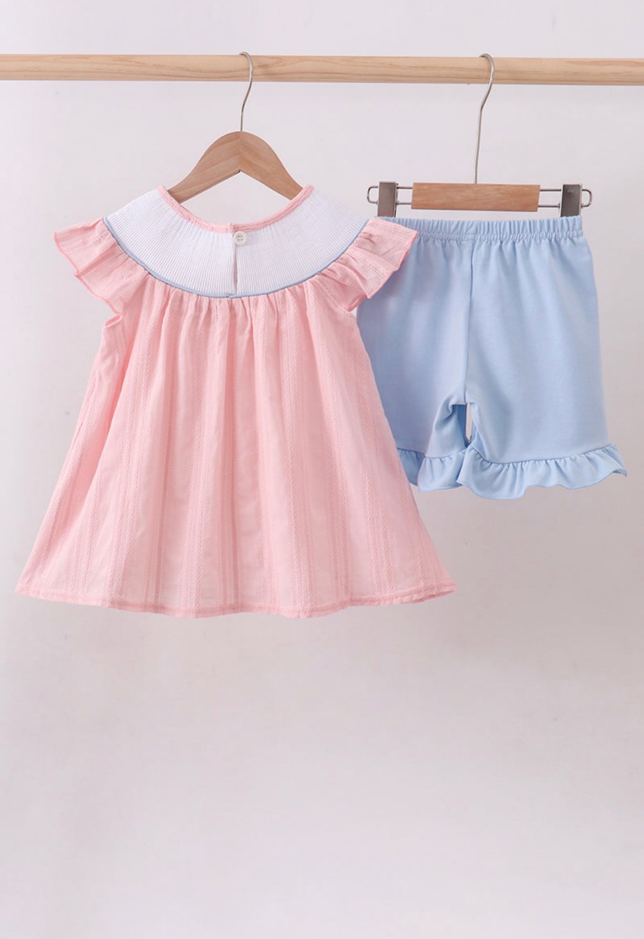 Twirl into enchantment with this darling pink princess set! Featuring delicate smocking and cascading ruffles, these shorts deliver fairy-tale charm with everyday comfort. Perfect for little royals who love to play dress-up or add a touch of whimsy to their wardrobe. Soft, sweet, and absolutely magical-because every girl deserves to feel like royalty.