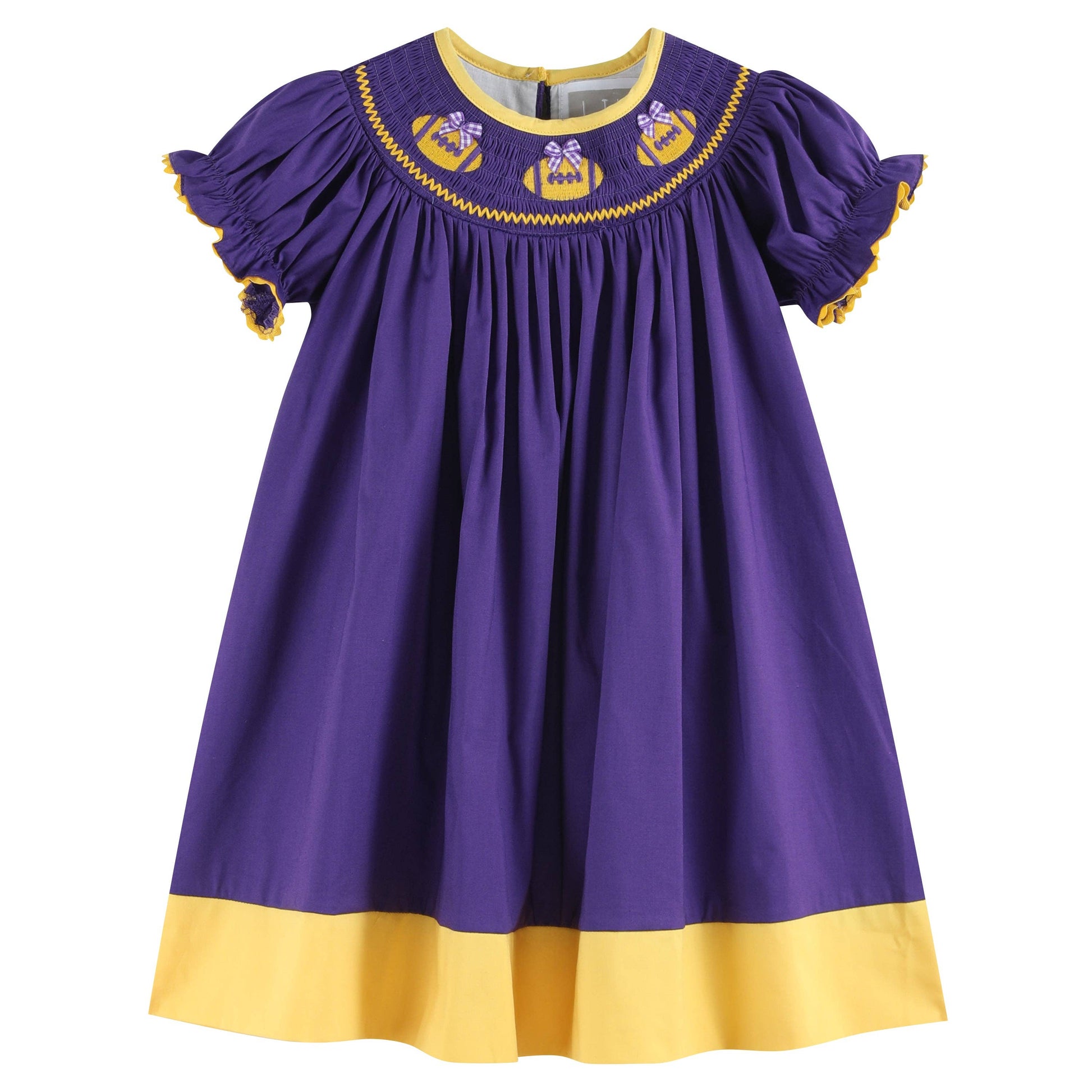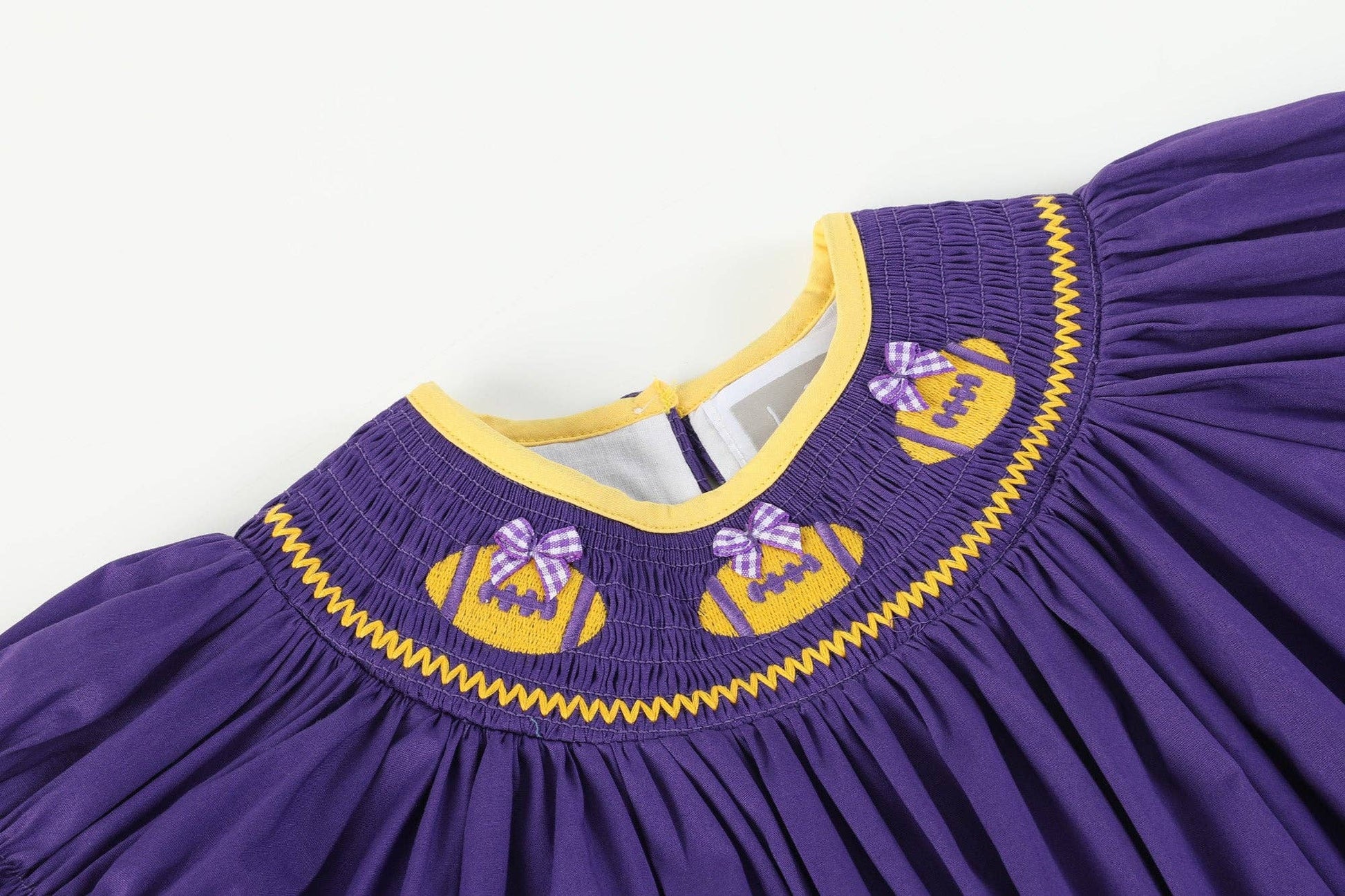 Score a touchdown in style with our Purple and Gold Football Smocked Bishop Dress! Playfully smocked along the neckline with embroidered footballs, each adorned with cute bows, this dress is a winning choice for your little sports enthusiast. In vibrant purple and gold, it's the perfect outfit for a day filled with cuteness and touchdowns!