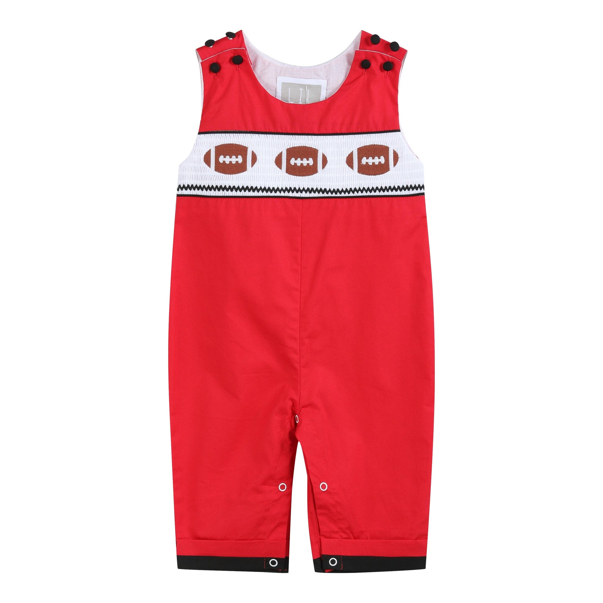 Get ready for a touchdown of cuteness with our Red and Black Football Smocked Overalls! Featuring adorable smocking on the chest and playful embroidery of footballs, this outfit is a winning play for your little quarterback. Kick off the fun with style and comfort in these charming football-themed overalls, perfect for your tiny sports enthusiast.