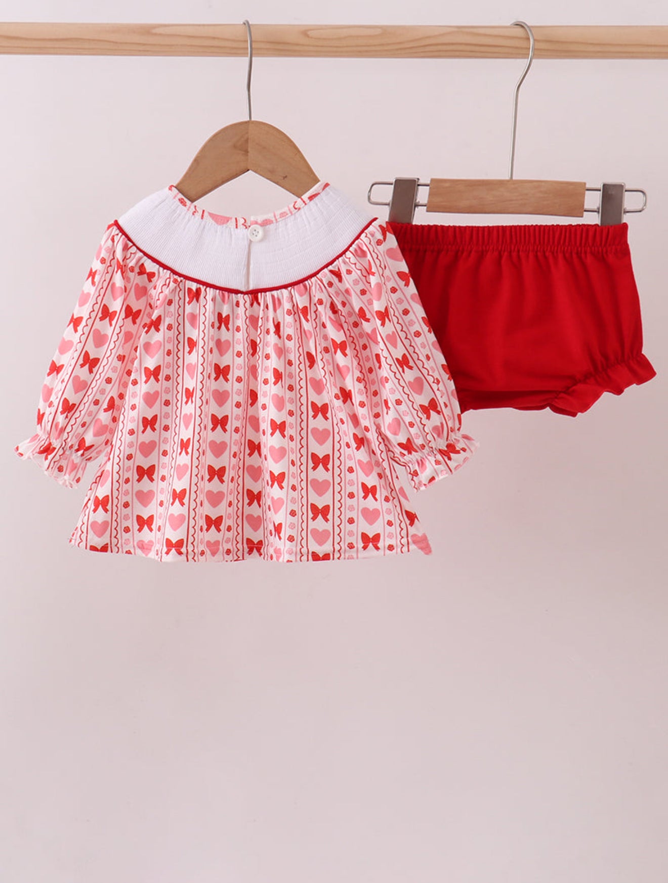 Adorable red heart bow smocked bloomer set perfect for little ones who love to twirl! This charming two-piece features delicate smocking details and a sweet heart bow accent that adds personality to any outfit. The soft, breathable fabric keeps your child comfortable all day long, while the elastic waistband ensures a perfect fit.
