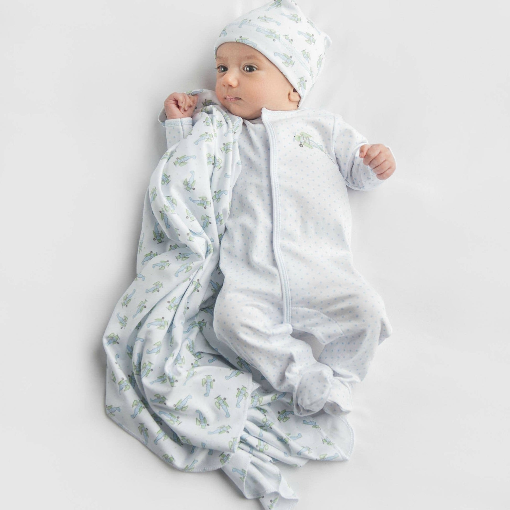 This classic footie is perfect for all-day cozy wear. Made from our luxurious Pima Cotton, this piece features delicate airplane embroidery on a subtle minidots fabric, with a beautiful picot trim along the edges.