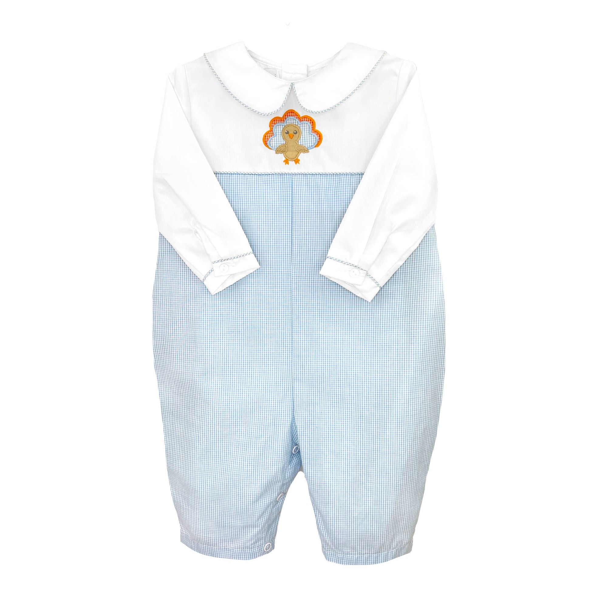 This adorable longall comes in a blue check fabric with a white top with a friendly turkey applique and a peter pan collar with blue check trimmed edges for an extra touch of detail.