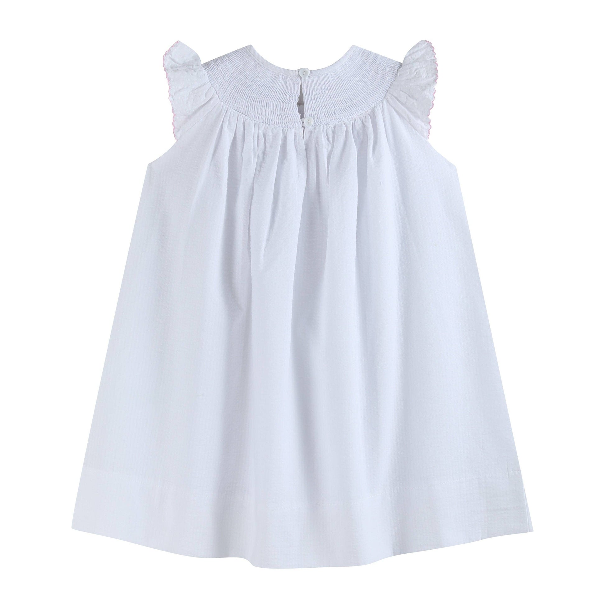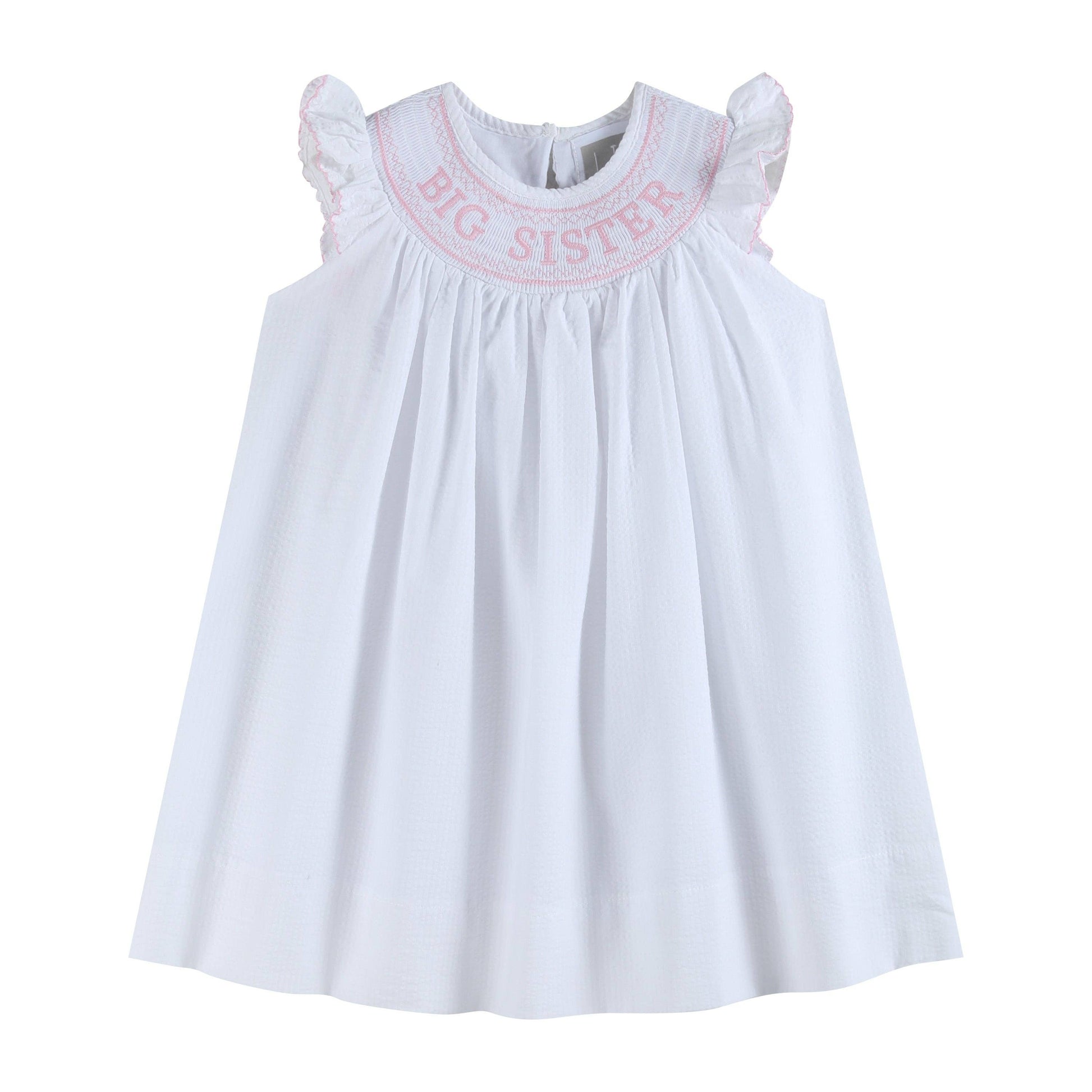 Dress your little princess in charm with our 'White Big Sister Smocked Bishop Dress.' Crafted from gentle 100% cotton, it boasts a delightful smocked neckline adorned with an embroidered 'Big Sister' motif, accentuated by lovely pink trim. Perfect for creating cherished moments and cherished memories.