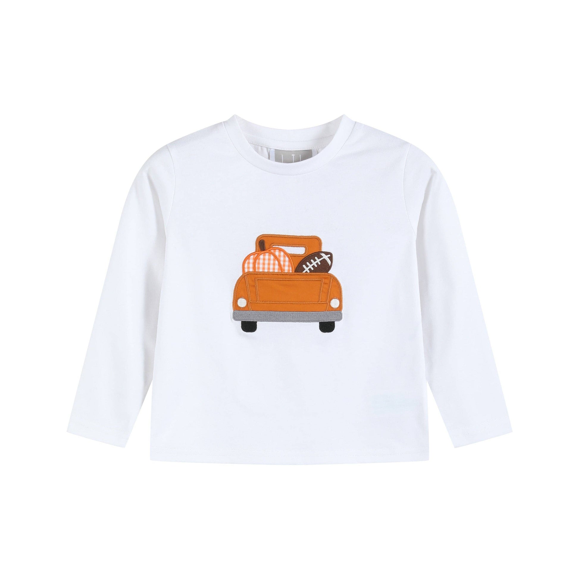 Get your little guy game-day ready with these White Football Truck Shirt and Brown Pants Set! Featuring an adorable applique truck carrying a pumpkin and football, this outfit is perfect for football season and Thanksgiving celebrations. Coordinating pants and long-sleeve shirt can be worn together or separately. Your sweet guy will love sporting this outfit perfect for cheering on their team and gobbling down turkey.
