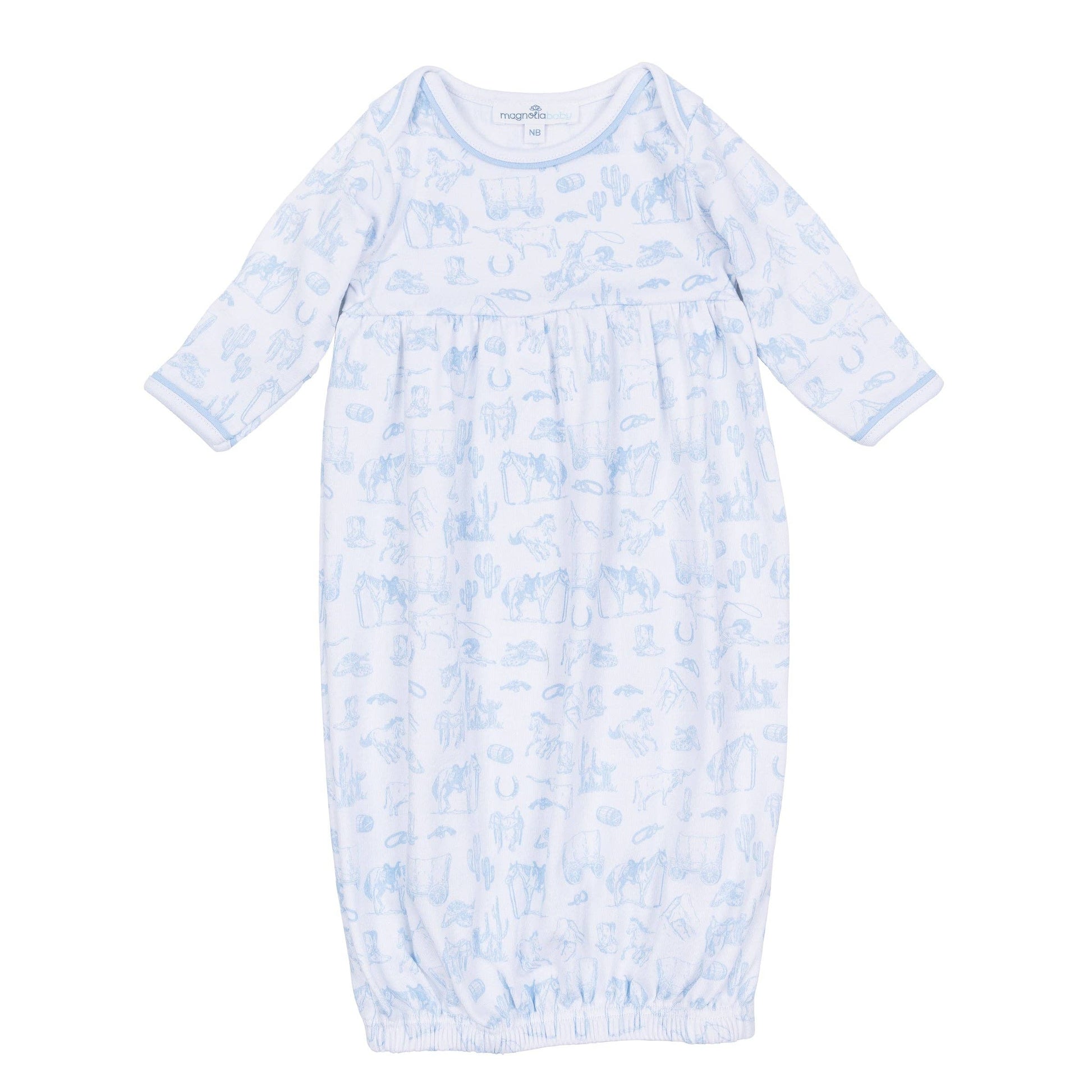 Perfect for those newborn days, this gathered gown combines comfort with a touch of elegance. Crafted from our luxurious Pima Cotton, it features a full Wild West-themed toile print in light blue and an easy-to-use gathered bottom.